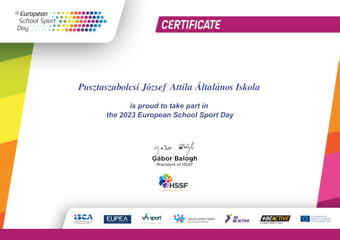 Szeptember 29-én közös énekléssel tisztelegtünk a Zenei Világnap előtt, majd az Európai Diáksport Napja vette kezdetét idén már a 6. alkalommal. Bemelegítést követően 2023m-es távot futottak le tanulóink és kísérőik. A helyszínt a pusztaszabolcsi polgárőrök biztosították, ezúton is köszönjük közreműködésüket. Ezt követően mind az alsó- mind a felső tagozatosok játékos, változatos mozgásformák keretében vettek részt egy élménydús sportnapon.