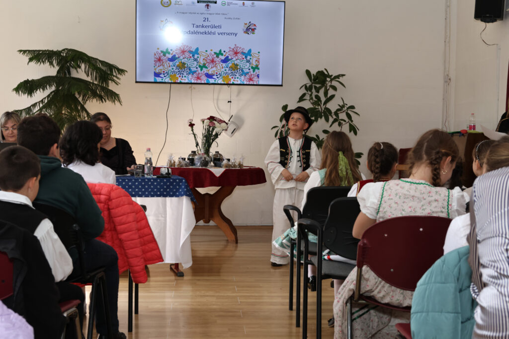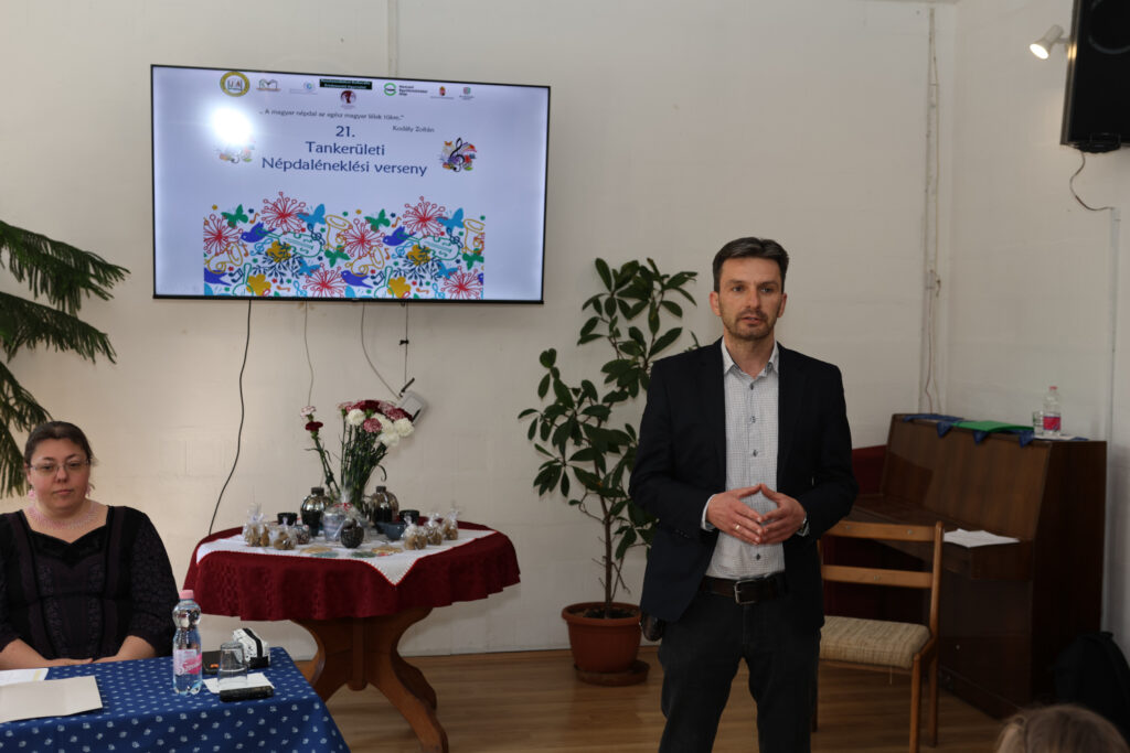 A 21. “Lélekvirág” Tankerületi Népdaléneklési versenyünket Tüke László Úr, a Pusztaszabolcsi József Attila Általános Iskola igazgatóhelyettese nyitotta meg. Hálás szívvel üdvözölt mindenkit, aki aznap összegyűlt, hogy együtt ünnepeljük a magyar népzene gazdag hagyományát és annak varázslatos dallamait. Örömmel töltött el minket, hogy a versenyünkre idén kimagasló létszámmal érkeztek, (74 gyermek)13 település képviseletében. A versenyünk mottója: “A magyar népdal az egész magyar lélek tükre  “Miközben énekelünk a lelkünk kis hangját szólaltatjuk meg, örömet szerezve magunknak és a hallgatóságnak. Ajándék, aki énekel és ajándék annak, aki hallgatja. Az adok-kapok kapcsolat egyensúlya.