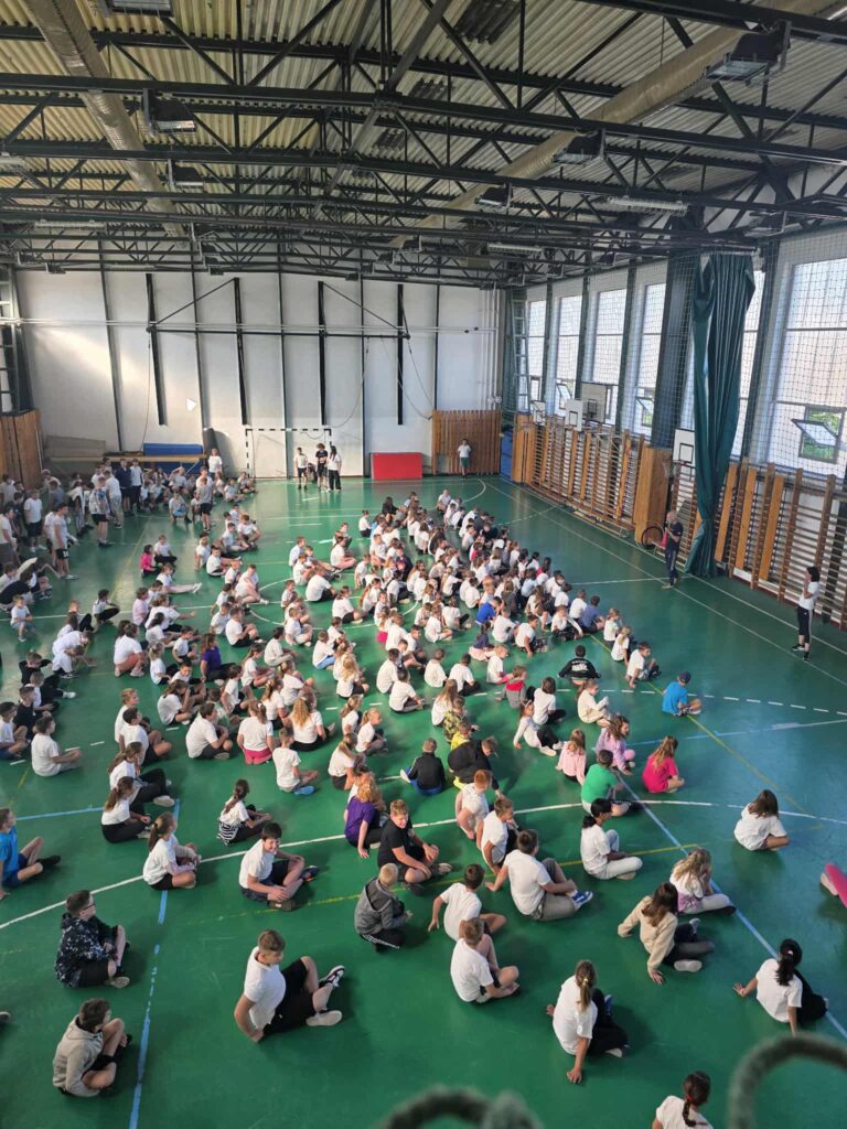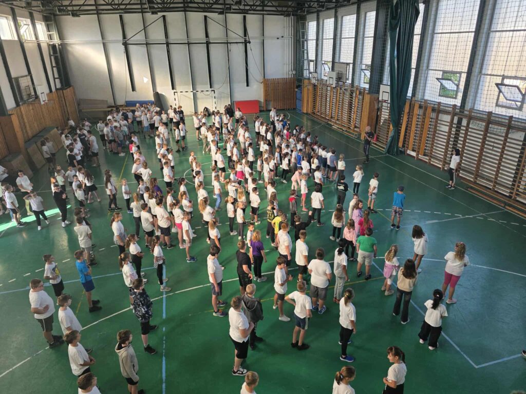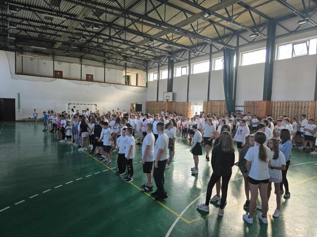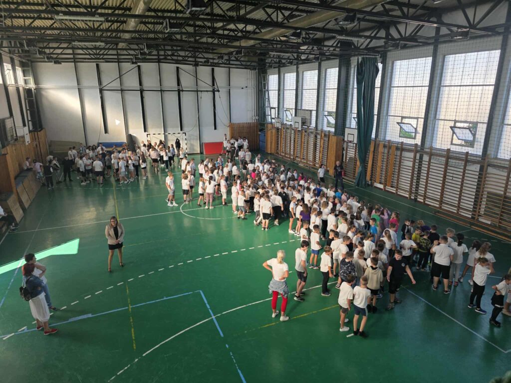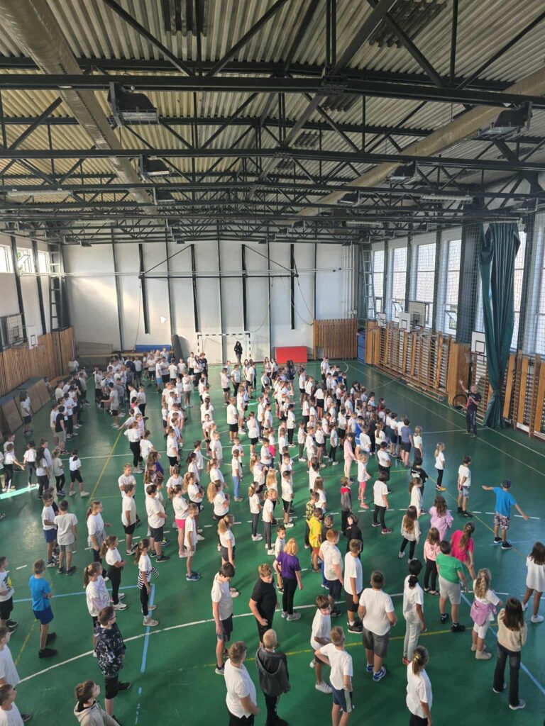 Szeptember első napján, reggel vidám hangulatban tartottuk meg az évnyitót iskolánkban. A gyerekek az iskola egyenpólójában, sportosan érkeztek, így közösen tisztelegtünk tornatermünk 40 éves jubíleuma előtt.
